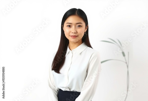 Half-length portrait of a 30-year-old Asian woman with a neutral expression