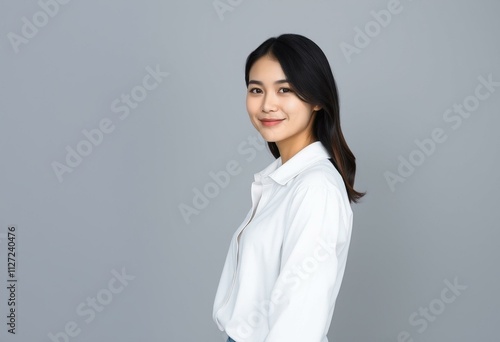 Half-length portrait of a young female with a neutral expression