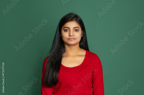 Half-length portrait of young beautiful smiling girl, student looking at camera isolated on dark green studio backgroud