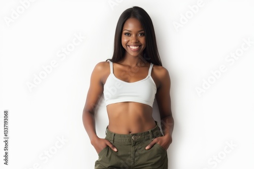 Half-Length (Waist-Up) portrait of young stylish smiling Ethiopian female model in sexy wear isolated on pure white background looking at camera