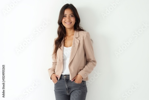 Half-Length (Waist-Up) portrait of young stylish smiling Indian female model in sexy wear isolated on pure white background looking at camera