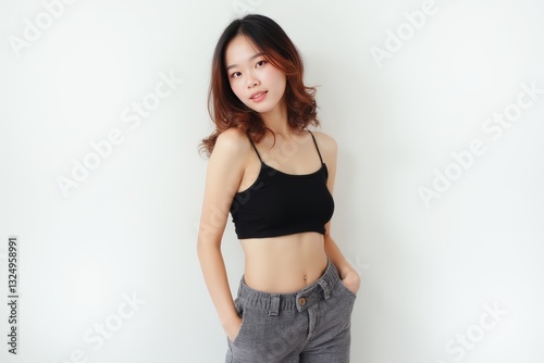 Half-Length (Waist-Up) portrait of young stylish smiling Indonesian female model in punk wear isolated on pure white background looking at camera