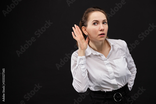 Hand near ear, tin to hear something. Girl in a white shirt on a black background.