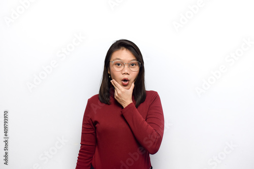 Hand on chin with surprise expression of Young beautiful asian women dress red shirt isolated on white background