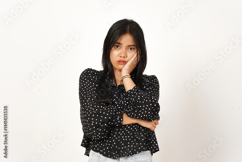 Hand on Face Boring Gesture Of Beautiful Asian Woman Wearing black Isolated On White Background