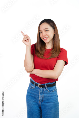 Hand pointing, Pretty Asian people wearing red t-shirt for a woman isolated on white background.