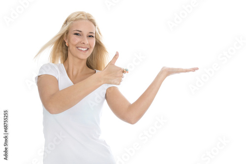 Handfläche: Mädchen präsentiert ein Produkt auf der Handfläche