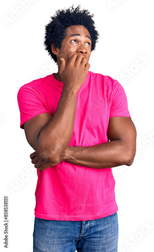 Handsome african american man with afro hair wearing casual pink tshirt looking stressed and nervous with hands on mouth biting nails. anxiety problem.