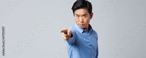 Handsome asian man with his finger pointing on light blue wide banner.