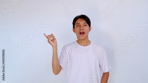 handsome asian young man shocked wearing white shirt gesture pointing sideways