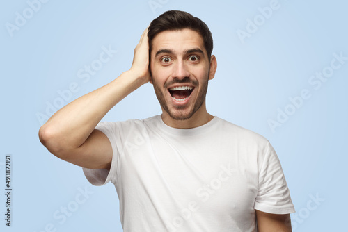 Handsome attractive surprised man looks at the camera astonished with big sale prices