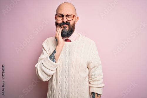 Handsome bald man with beard and tattoo wearing glasses and sweater over pink background touching mouth with hand with painful expression because of toothache or dental illness on teeth. Dentist