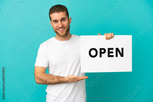 Handsome blonde man over isolated blue background holding a placard with text OPEN with happy expression