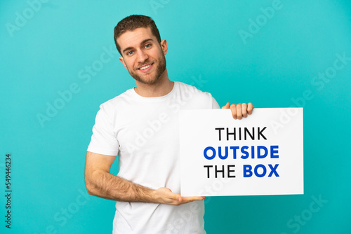 Handsome blonde man over isolated blue background holding a placard with text Think Outside The Box with happy expression