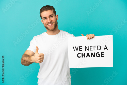 Handsome blonde man over isolated blue background holding a placard with text We Need a Change with thumb up