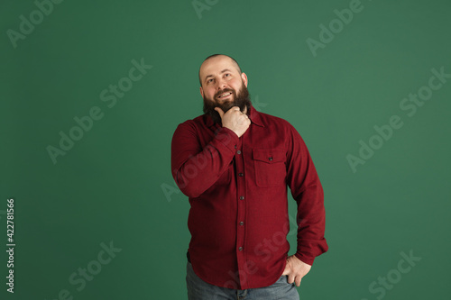 Handsome caucasian man portrait isolated on green studio background with copyspace