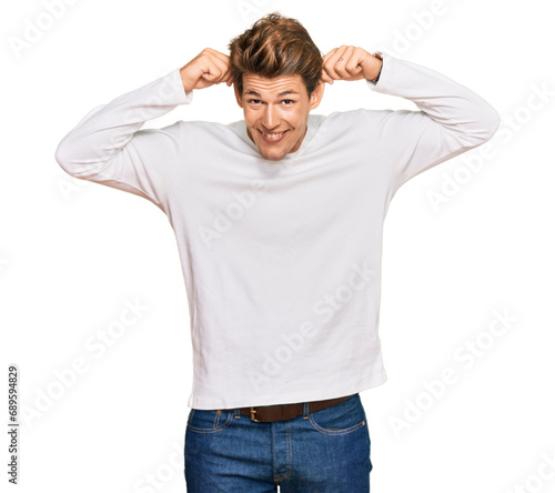 Handsome caucasian man wearing casual white sweater smiling pulling ears with fingers, funny gesture. audition problem