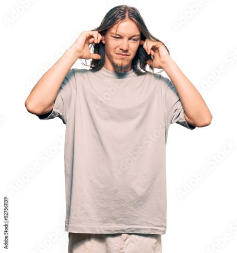 Handsome caucasian man with long hair wearing casual clothes covering ears with fingers with annoyed expression for the noise of loud music. deaf concept.