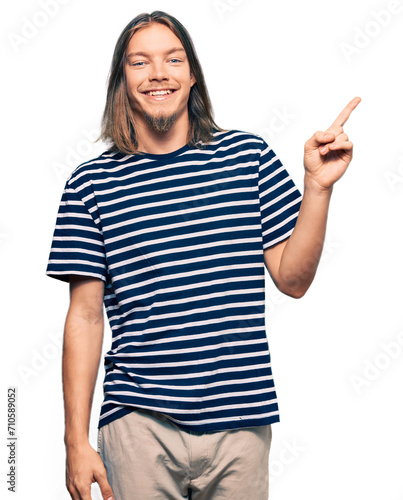 Handsome caucasian man with long hair wearing casual striped t-shirt with a big smile on face, pointing with hand and finger to the side looking at the camera.
