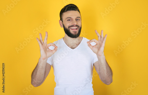 Handsome excited modern young bearded stylish man is posing with a wide toothy smile on yellow background in studio