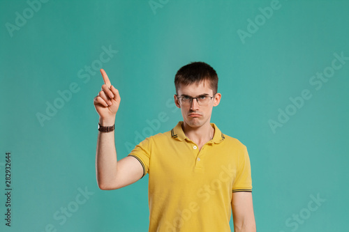 Handsome guy in a yellow casual t-shirt is posing over a blue background.