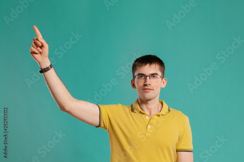 Handsome guy in a yellow casual t-shirt is posing over a blue background.