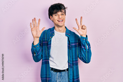 Handsome hipster young man wearing casual white t shirt and vintage shirt showing and pointing up with fingers number eight while smiling confident and happy.