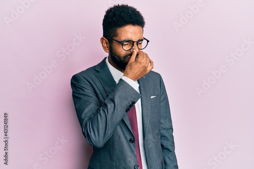 Handsome hispanic business man with beard wearing business suit and tie smelling something stinky and disgusting, intolerable smell, holding breath with fingers on nose. bad smell