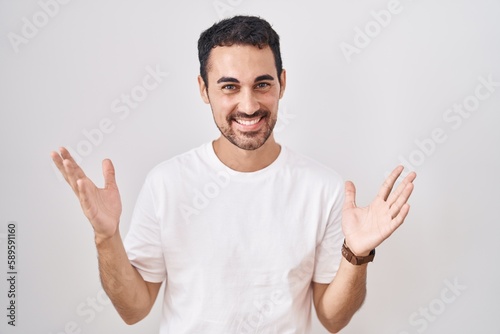 Handsome hispanic man standing over white background celebrating crazy and amazed for success with arms raised and open eyes screaming excited. winner concept