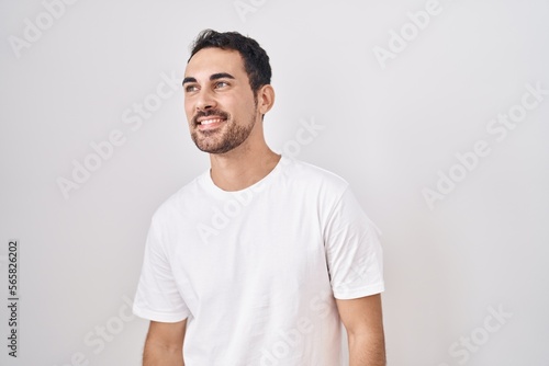 Handsome hispanic man standing over white background looking away to side with smile on face, natural expression. laughing confident.