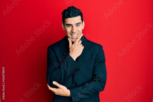 Handsome hispanic man wearing business clothes looking confident at the camera smiling with crossed arms and hand raised on chin. thinking positive.