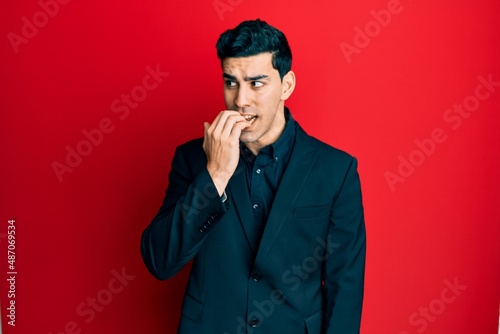 Handsome hispanic man wearing business clothes looking stressed and nervous with hands on mouth biting nails. anxiety problem.