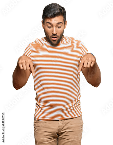 Handsome hispanic man wearing casual clothes pointing down with fingers showing advertisement, surprised face and open mouth