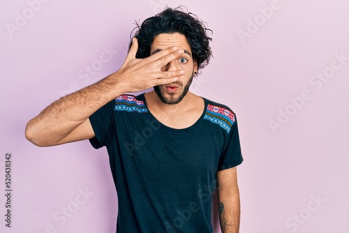 Handsome hispanic man wearing casual t shirt peeking in shock covering face and eyes with hand, looking through fingers afraid
