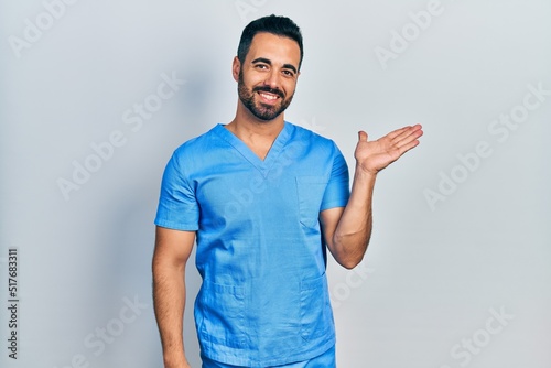 Handsome hispanic man with beard wearing blue male nurse uniform smiling cheerful presenting and pointing with palm of hand looking at the camera.