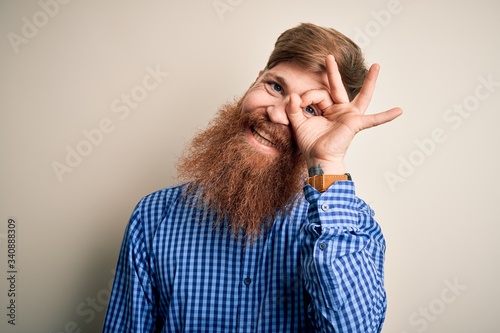 Handsome Irish redhead business man with beard standing over isolated background doing ok gesture with hand smiling, eye looking through fingers with happy face.