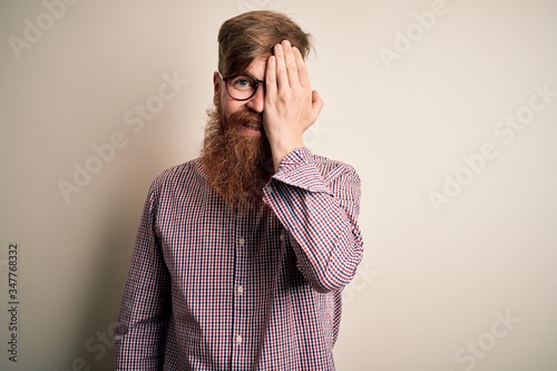Handsome Irish redhead business man with beard wearing glasses over isolated background covering one eye with hand, confident smile on face and surprise emotion.