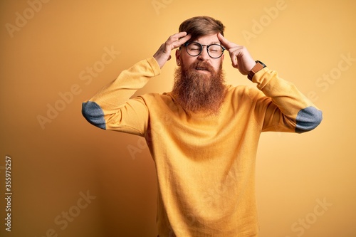 Handsome Irish redhead man with beard wearing glasses over yellow isolated background with hand on headache because stress. Suffering migraine.