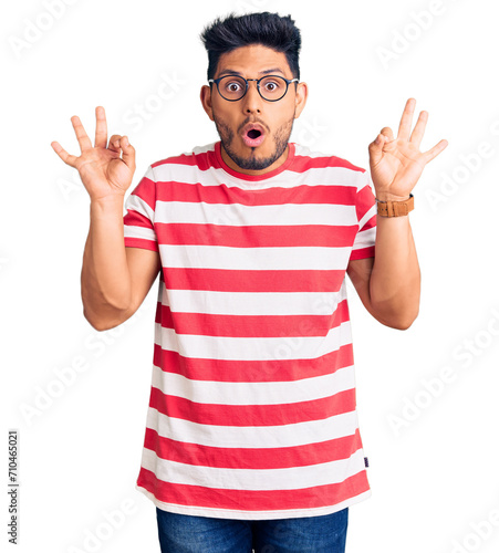 Handsome latin american young man wearing casual clothes and glasses looking surprised and shocked doing ok approval symbol with fingers. crazy expression