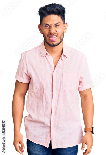 Handsome latin american young man wearing casual summer shirt sticking tongue out happy with funny expression. emotion concept.