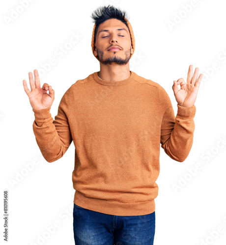 Handsome latin american young man wearing winter sweater and wool hat relax and smiling with eyes closed doing meditation gesture with fingers. yoga concept.