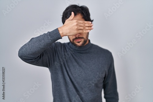 Handsome latin man standing over isolated background covering eyes with hand, looking serious and sad. sightless, hiding and rejection concept