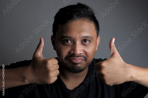handsome man showing two thumb at camera, friendly guy showing positive emotion, excited cute male model smiling at you