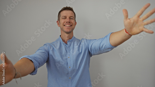Handsome man smiling with open arms in a blue shirt against an isolated white background, conveying friendliness and positive energy.