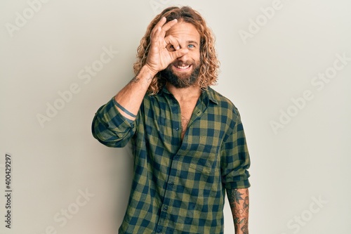 Handsome man with beard and long hair wearing casual clothes doing ok gesture with hand smiling, eye looking through fingers with happy face.