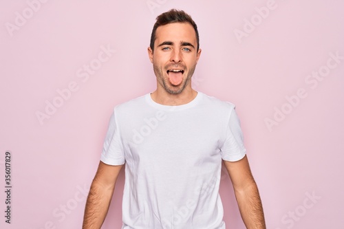 Handsome man with blue eyes wearing casual white t-shirt standing over pink background sticking tongue out happy with funny expression. Emotion concept.