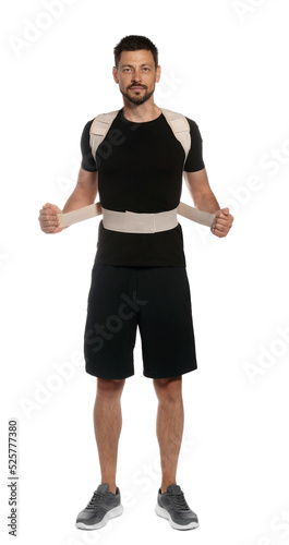 Handsome man with orthopedic corset on white background