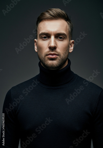 Handsome man with stylish hair and beard wears a black turtleneck sweater indoors