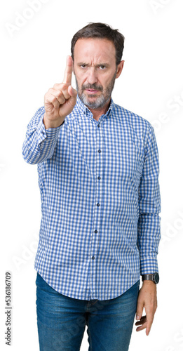Handsome middle age elegant senior man over isolated background Pointing with finger up and angry expression