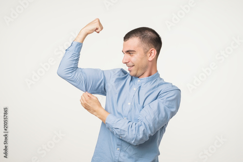 Handsome middle age man in blue shirt pointing biceps expressing strength and healthy life.